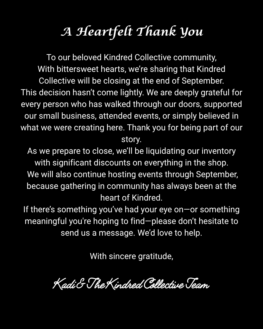 We are a holistic boutique with hand-picked crystals, handmade teas & jewelry, essential oils, reiki services, tarot readings/guidance, massage therapy, events & more. We’ve been in Grove City for four years now and are proudly women-owned and operated! Our owner Kadi is the heart and soul behind Kindred Collective and it’s mission to create a safe space for the people of our community. With the assistance of various healers and artists in the area, we’ve been able to spread the love of Kindred to those around us and gain new friends and customers.